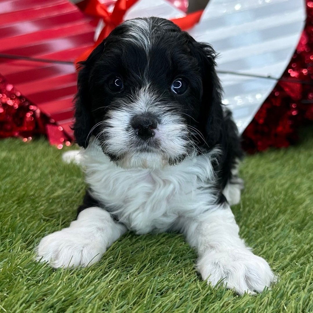 Hi, I’m Minnie! I’m a 6-week-old female Cavapoo. My dad is a Poodle and my mom is a Cavalier King Charles Spaniel. I have a beautiful black & white coat, and I was born on December 31. I’ll be ready to go home to my forever family after March 4, once I’m grown enough to leave my litter. When I reach my adult size, I should weigh between 6–9 lbs. I’m excited to find my forever family and share my love.